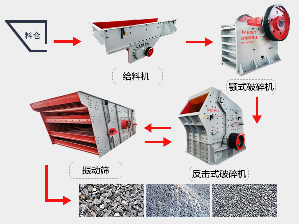由反擊式破碎機細碎后的物料通過振動篩,將粒級不同的物料進行有效的篩分,不合格的返回上層進行重新破碎;