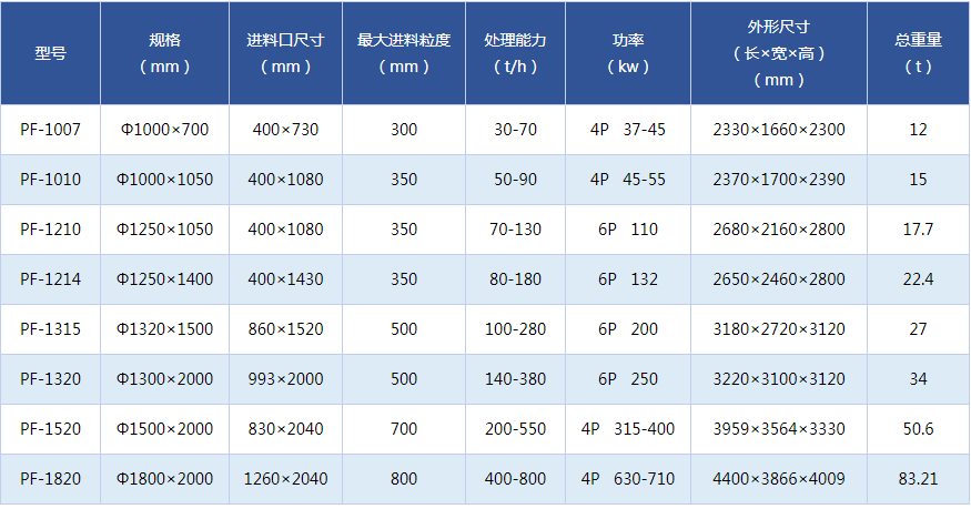 反擊破當(dāng)然不止PF-1210一個(gè)型號(hào),根據(jù)原料的不同、成品需求的不同、產(chǎn)量預(yù)期的不同,我們有多重型號(hào)的反擊破供客戶(hù)選購(gòu),具體看參數(shù)表: