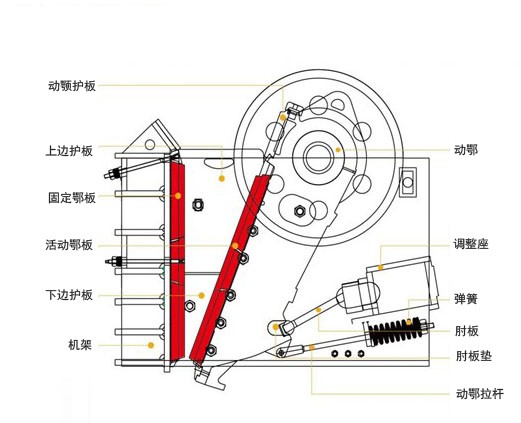 調整排料口時先松開T型螺栓,接著用液壓起頂機或起頂螺栓頂開調整座,換入所需厚度的墊片,然后退出液壓起頂機或起頂螺栓。動顎借自重和彈簧的作用力,自動壓緊墊片組,并使調整座緊貼耳座,最后鎖緊調整座和墊片組。