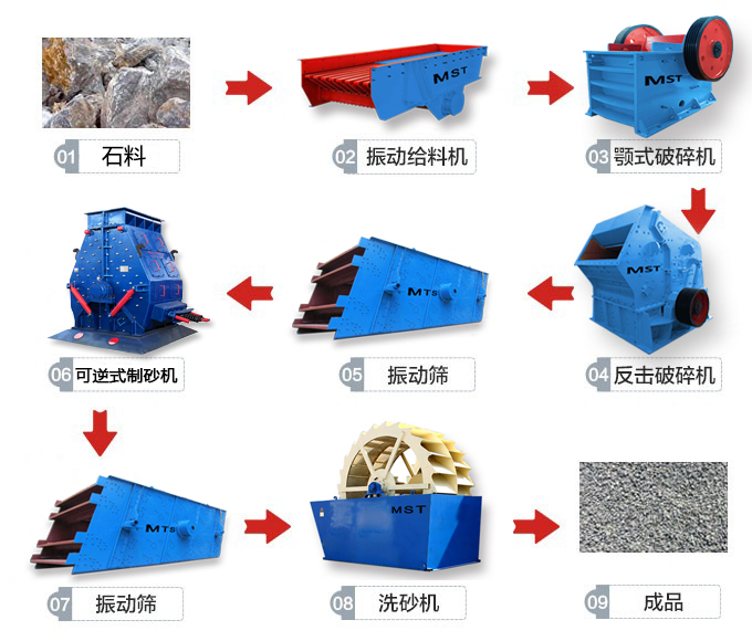 1、給料機+顎破+反擊破+制砂機+振動篩